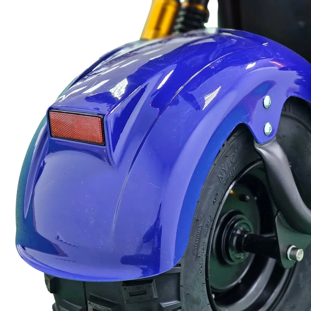 Citycoco GT X7 PRO выделяется не только техническими характеристиками, но и высоким уровнем комфорта. Складные подножки для второго пассажира и просторная дека для ног делают поездки удобными для двоих. Гидравлические тормоза гарантируют безопасное торможение, а система освещения, включающая фары, страбаскопы, стоп-сигнал и поворотники, обеспечивает видимость и безопасность в любое время суток. Этот скутер — идеальный выбор для тех, кто ценит стиль, мощность и функциональность.