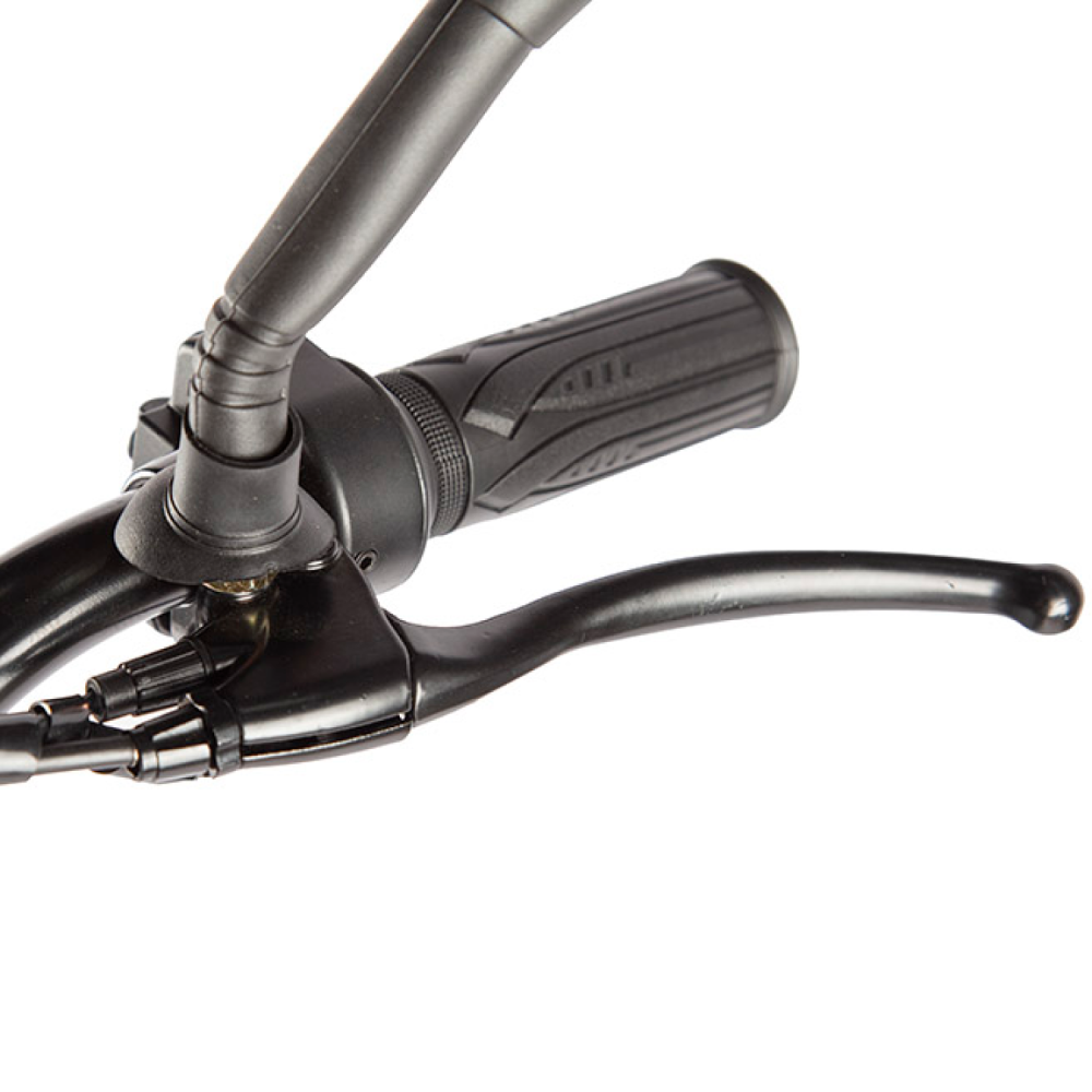 Платформа для ног, как у скутера, позволяет пассажиру ехать удобно, не зависая в воздухе. А ручка газа превращает езду в расслабленное удовольствие без педалирования.