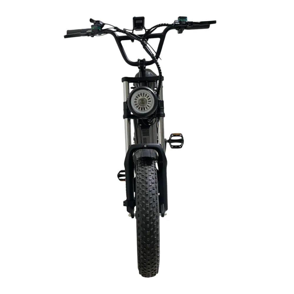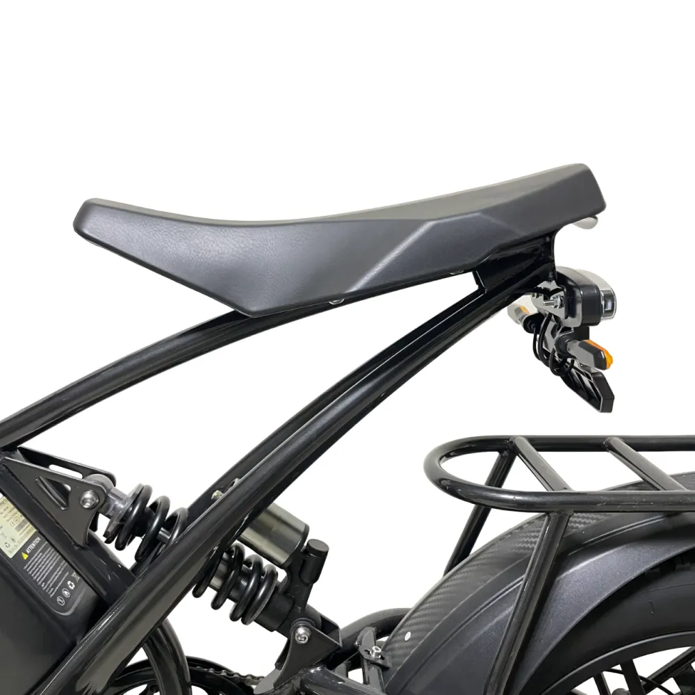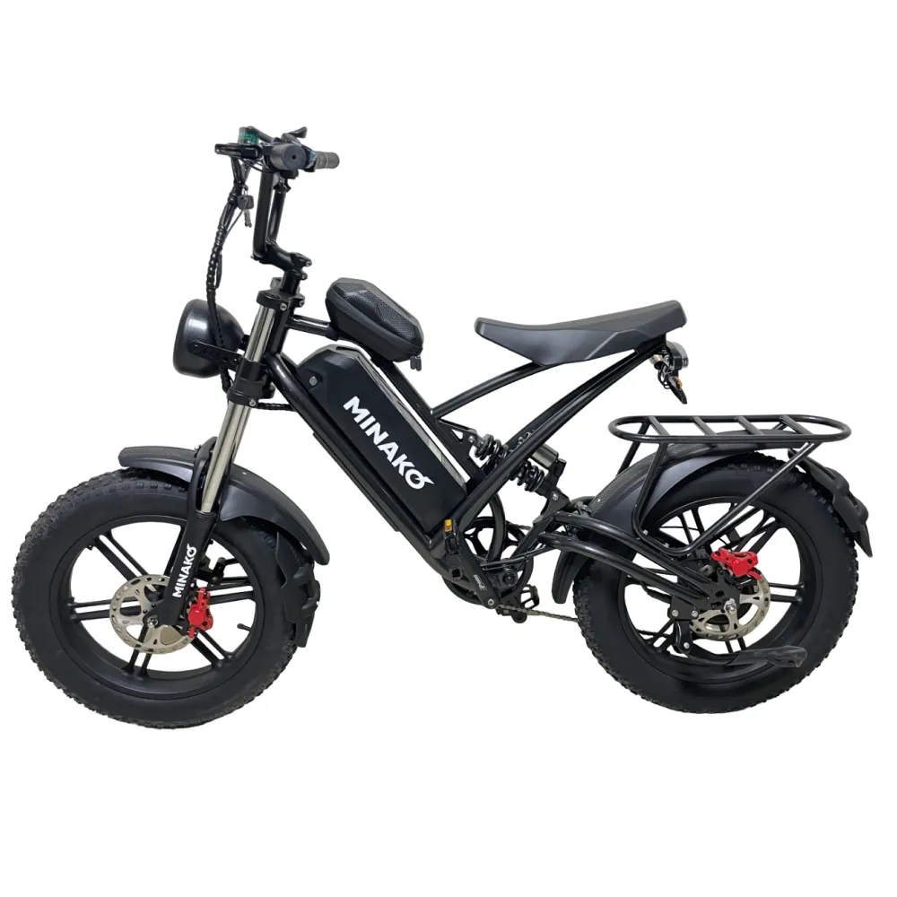 Электровелосипед Minako FOX 15Ah (Литые) в черном цвете – супербайк по лучшей стоимости предлагает купить наш интернет-магазин. Модель относится к категории быстро распродаваемой. Внешне напоминает мопед. Выглядит круто и презентабельно. Предназначен для активных пользователей, не представляющих жизни без экстрима. Прочная надежная рама, фирменная начинка обещает скоростную комфортную езду. Удобное комфортабельное седло исключает нагрузку на позвоночник, появление ощущения усталости. При мощности электромотора 1000 Вт максимальные скоростные параметры составляют 55 км/час. Емкости аккумулятора (15000мАч) достаточно для преодоления дистанции – 30 км). Батарея размещена в защитном блоке, исключающим внешнее повреждение устройства. 20-дюймовые колеса с 4-дюймовыми шинами выглядят агрессивно, накатистые, отлично сцепляемые с разными вилами поверхности. Безопасность эксплуатации гарантирована большой светодиодной фарой, фирменными тормозами и наличием бортового компьютера. Последний предоставляет полезную для райдера информацию: скоростные параметры и степень зарядки батареи. На электровелосипеде безопасно ездить по ровной дороге и пересеченной местности, в непогоду и любе время суток. Для заказа техники предлагаем сделать заявку сейчас или позвонить менеджеру.